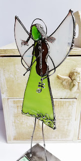 Projekt i wykonanie autorskie. Anioł ze szkła Spectrum wykonany w technice Tiffany. Treść dedykacji jest do uzgodnienia.